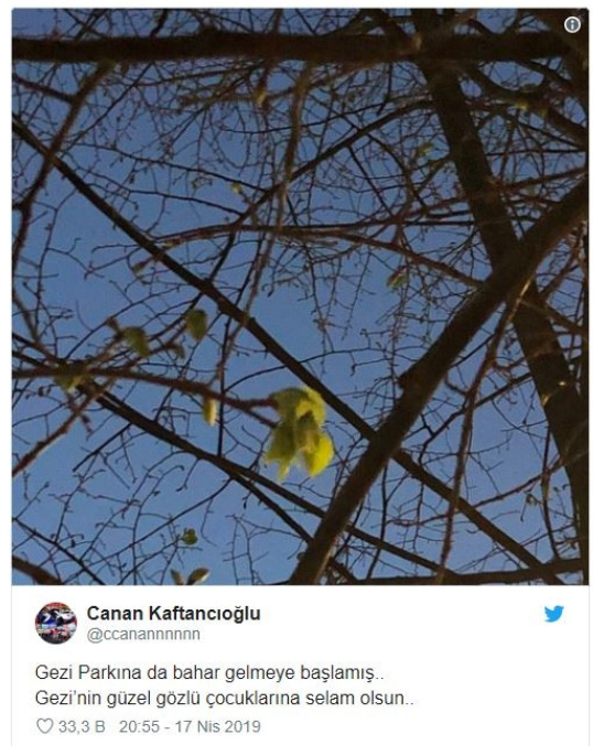 Kaftancıoğlu, paylaşımında "Gezi Parkına da bahar gelmeye başlamış. Gezi’nin güzel gözlü çocuklarına selam olsun." ifadelerine yer verdi.