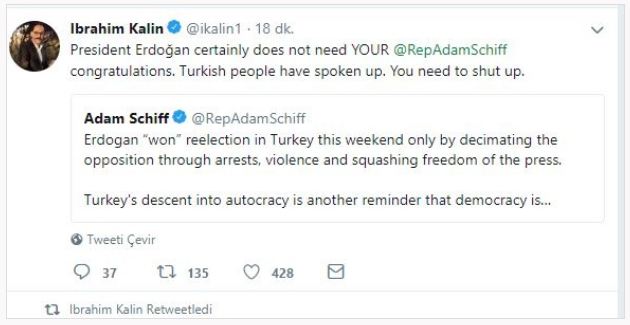 Amerika Birleşik Devleti Temsilciler Meclisi Üyesi Adam Schiff'in Erdoğan'ın tartışmasız zaferiyle sonuçlanan seçimler sonrası twitter hesabından paylaştığı, " Erdoğan, bu hafta sonu Türkiye'de sadece tutuklama, şiddet, basın özgürlüğünü kısıtlayarak ve muhalefeti ortadan kaldırarak yeniden seçimleri "kazandı". Bu Türkiye'nin otokrasiye dönüşmesi, demokrasinin dünya çapında saldırıya uğradığı konusunda bir başka hatırlatmadır. O yüzden tebrik etmiyorum" mesajına Cumhurbaşkanlığı Sözcüsü İbrahim Kalın'dan tokat gibi cevap geldi.
