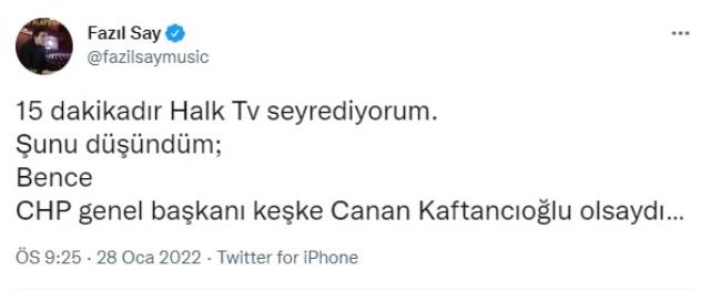Fazıl Say, Twitter hesabından yaptığı paylaşımda, "15 dakikadır Halk TV seyrediyorum. Şunu düşündüm; bence CHP genel başkanı keşke Canan Kaftancıoğlu olsaydı…" ifadelerini kullandı.