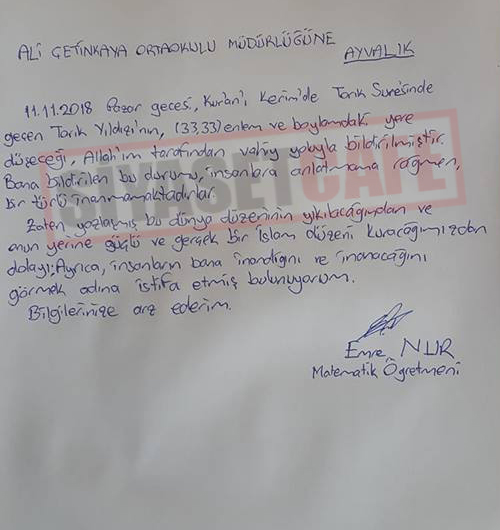 Öğretmen Emre Nur, istifa dilekçesinde İslam’ın bazı şartları olduğunu söyledi ve kıyametin kopacağını haber verdi.