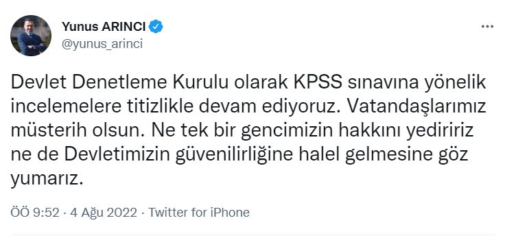 Devlet Denetleme Kurulu Başkanı Yunus Arıncı "Devlet Denetleme Kurulu olarak KPSS sınavına yönelik incelemelere titizlikle devam ediyoruz. Vatandaşlarımız müsterih olsun. Ne tek bir gencimizin hakkını yediririz ne de Devletimizin güvenilirliğine halel gelmesine göz yumarız" dedi.