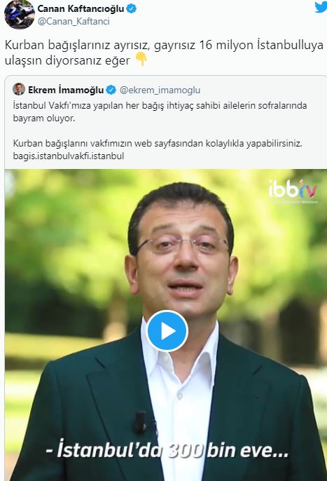 CHP İstanbul İl Başkanı Canan Kaftancıoğlu, Twitter hesabından İstanbul Büyükşehir Belediye Başkanı Ekrem İmamoğlu'nun kurban bağışı çağrısında bulunduğu paylaşımını retweet etti.