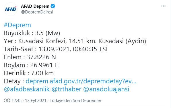 Boğaziçi Üniversitesi Kandilli Rasathanesi ve Afet ve Acil Durum Yönetimi Başkanlığı (AFAD)'ın sürekli olarak güncellediği ve kamuoyuna duyurduğu son depremler listesine göre Ege Denizi Kuşadası yarımadası açıklarında saat 00:40'da 3.5 şiddetinde bir son dakika depremi meydana geldi.