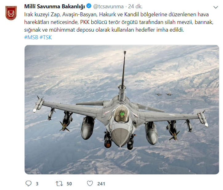 Bakanlığın Twitter hesabından yapılan açıklamada, "Irak kuzeyi Zap, Avaşin-Basyan, Hakurk ve Kandil bölgelerine düzenlenen hava harekâtları neticesinde, PKK bölücü terör örgütü tarafından silah mevzii, barınak, sığınak ve mühimmat deposu olarak kullanılan hedefler imha edildi" denildi.