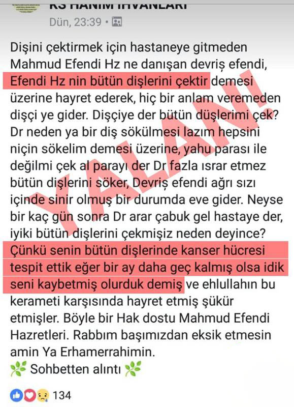 Mahmut Efendi tarikatına bağlı bir kadın grubunda paylaşılan fotoğrafta, sözde bir dervişin hastaneye gitmeden önce Mahmut Efendi'ye danıştığı, Mahmut Efendi'nin de dervişe bütün dişlerini çektirmesi gerektiğini söylediği aktarılıyor.