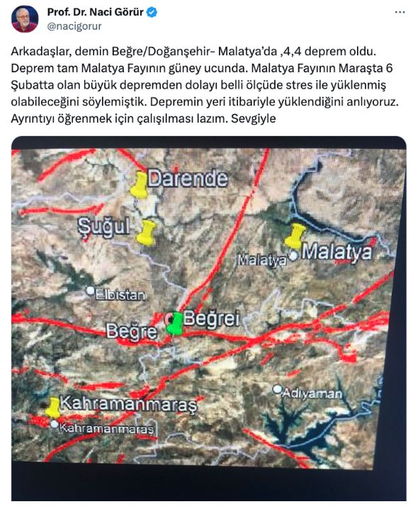 Malatya'nın Doğanşehir ilçesinde sabah saatlerinde meydana gelen 4,3 şiddetindeki depremin ardından Prof. Dr. Naci Görür'den dikkat çeken bir uyarı geldi.