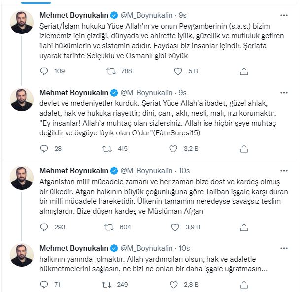 Bize düşen kardeş ve Müslüman Afgan halkının yanında olmaktır. Allah yardımcıları olsun, hak ve adaletle hükmetmelerini sağlasın, ne bizi ne onları bir daha işgale uğratmasın." diye yazdı.