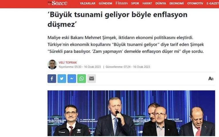 Sözcü yalan haberlerine bir yenisi daha ekledi. Sözcü'nün "Büyük tsunami geliyor böyle enflasyon düşmez" başlığı ile yayımladığı haberi yalanlayan Eski Maliye Bakanı Mehmet Şimşek "Şahsımdan duymadığınız hiçbir habere lütfen itibar etmeyiniz" dedi.