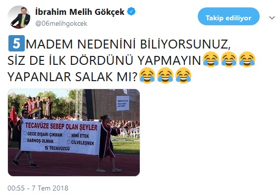 Panel sırasında bir kadın öğrenci, Melih Gökçek’in 7 Temmuz 2018’de ODTÜ Mezuniyet Töreni’ndeki bir pankarta ilişkin attığı sosyal medya mesajını hatırlattı.