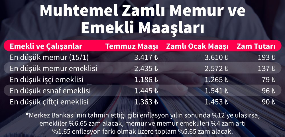 Bu da emeklilere yüzde 6.65 zam, memur ve memur emeklilerine yüzde 1.65 enflasyon farkı verileceği anlamına geliyor.
