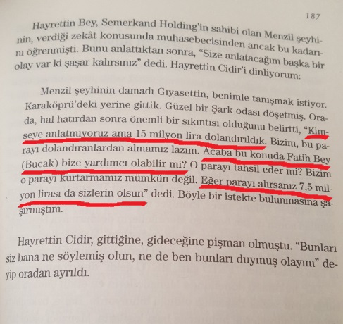 Menzil cemaati ile ilgili çarpıcı bilgiler veren Öztürk, kitabında Menzil şeyhinin bir vatandaşa 15 Milyon lira dolandırıldığını da yazdı.