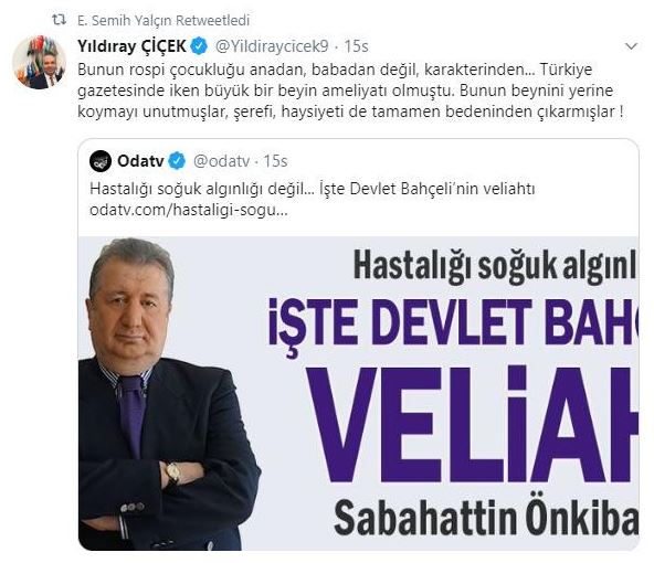 MHP Genel Başkanı Devlet Bahçeli’nin basın danışmanı Yıldıray Çiçek, Sabahattin Önkibar’a "Bunun rospi çocukluğu anadan, babadan değil, karakterinden…" dedi, Çiöek'in Tweetini MHP!li Yalçın'da paylaştı.