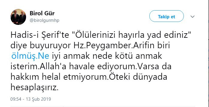 MHP İstanbul İl Başkanı Birol Gür’ün ‘Hakkımı helal etmiyorum. Öteki dünyada hesaplaşırız” paylaşımı da sosyal medyada eleştiri konusu oldu. MHP İstanbul İl Başkanı Birol Gür yaptığı paylaşımda şu ifadeleri kullandı;