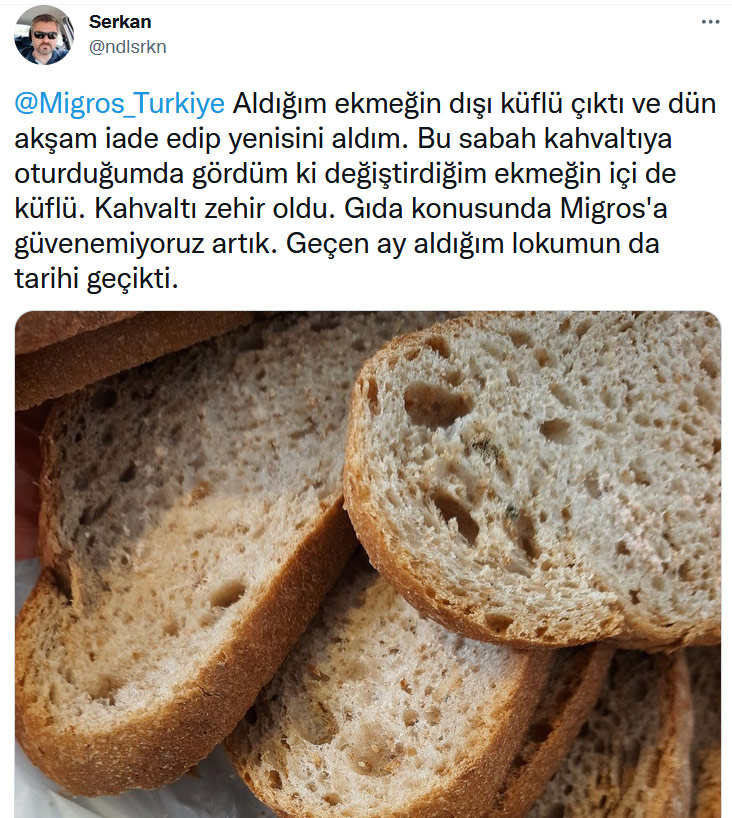 Bir başka sosyal medya kullanıcısı “Aldığım ekmeğin dışı küflü çıktı ve dün akşam iade edip yenisini aldım. Bu sabah kahvaltıya oturduğumda gördüm ki değiştirdiğim ekmeğin içi de küflü. Kahvaltı zehir oldu. Gıda konusunda Migros'a güvenemiyoruz artık. Geçen ay aldığım lokumun da tarihi geçikti” mesajıyla adlığı ekmeğin fotoğrafı yayımladı.
