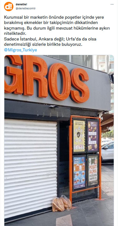 Migros market zincirinin Şanlıurfa’daki şubesinin önüne poşetler içerisinde ekmekler yere bırakıldı. Bu görüntüler sosyal medyada tepki çekti.