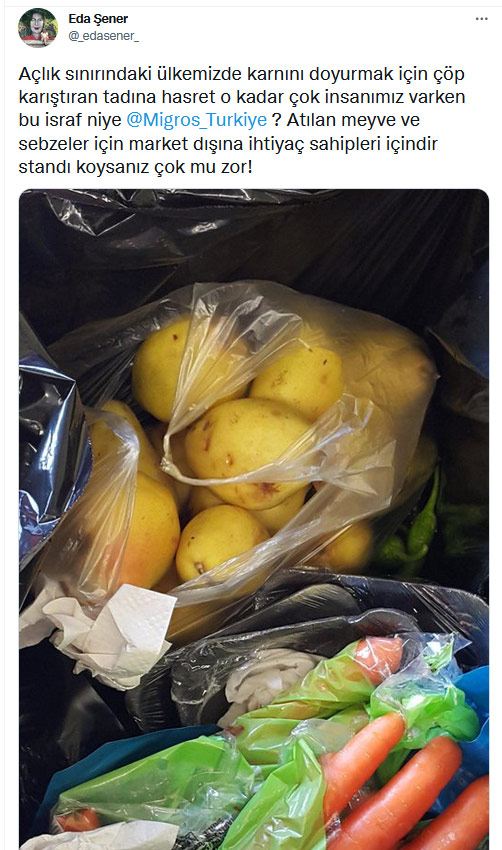 Migros’taki sebze meyvelerin çöpe atılması da tepki çekti. Bir müşterisi “Açlık sınırındaki ülkemizde karnını doyurmak için çöp karıştıran tadına hasret o kadar çok insanımız varken bu israf niye @Migros_Turkiye ? Atılan meyve ve sebzeler için market dışına ihtiyaç sahipleri içindir standı koysanız çok mu zor!” diye eleştirdi.