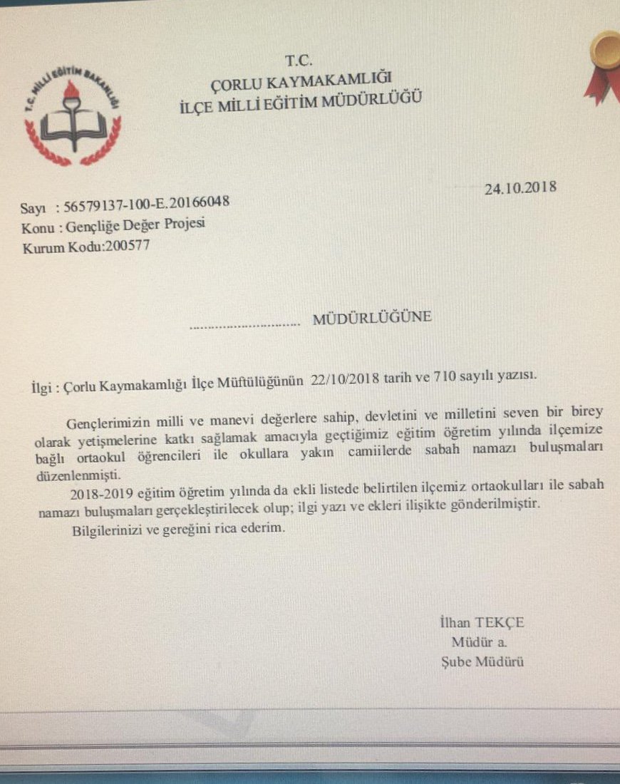 soL’un haberine göre Çorlu İlçe Milli Eğitim Şube Müdürü İlhan Tekçe’nin imzasını taşıyan yazıda, öğrenciler için okula yakın bulunan camilerde sabah namazı buluşmalarının düzenlenmesini istenildi . Okullara gönderilen yazıda şu ifadelere yer verildi: