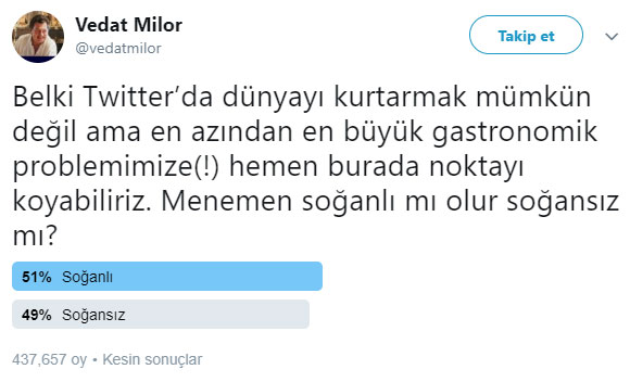 Yemek uzmanı Vedat Milor, takipçilerine "Menemen soğanlı mı olur soğansız mı" diye sormuş sosyal medyada anket başlatmıştı. Anket sonuçlandı.
