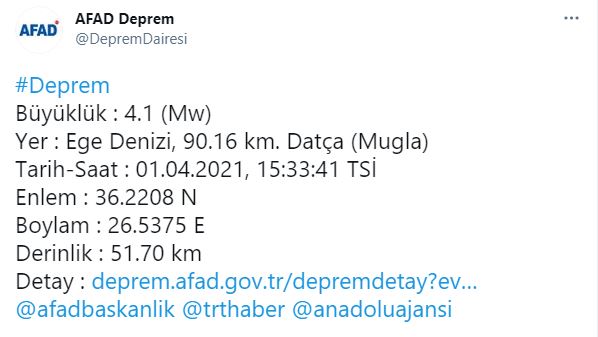 AFAD resmi sosyal medya hesabından Muğla'daki depremi duyurdu.