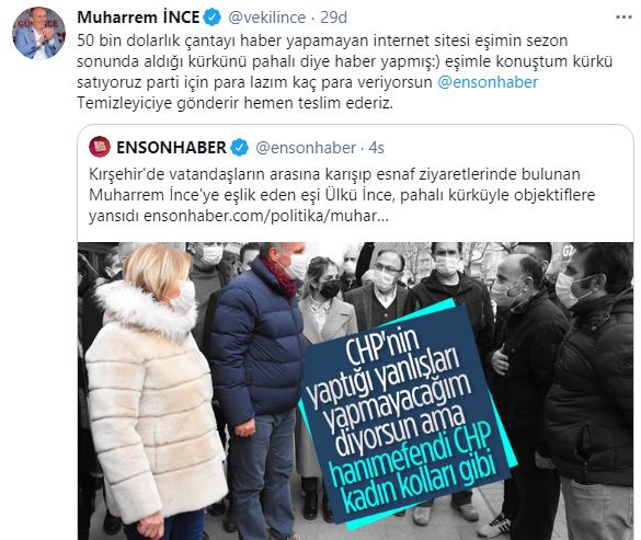 Muharrem İnce haberi etiketleyerek paylaştığı twitte haberi eleştirerek "50 bin dolarlık çantayı haber yapamayan internet sitesi eşimin sezon sonunda aldığı kürkünü pahalı diye haber yapmış:)" dedi