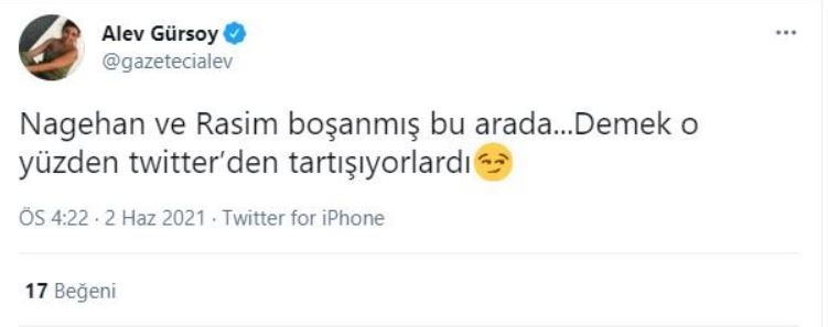 "Nagehan ve Rasim boşanmış bu arada...Demek o yüzden twitter’den tartışıyorlardı"