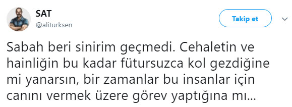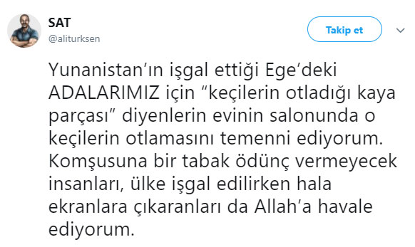 Ali Türkşen, Twitter’da “Yunanistan’ın işgal ettiği Ege’deki adalarımız için ‘keçilerin otladığı kaya parçası’ diyenlerin evinin salonunda o keçilerin otlamasını temenni ediyorum. Komşusuna bir tabak ödünç vermeyecek insanları, ülke işgal edilirken hala ekranlara çıkaranları da Allah’a havale ediyorum. Sabah beri sinirim geçmedi. Cehaletin ve hainliğin bu kadar fütursuzca kol gezdiğine mi yanarsın, bir zamanlar bu insanlar için canını vermek üzere görev yaptığına mı...” mesajlarını paylaştı.