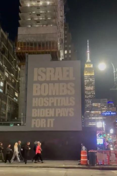 Panolar, kısa süreli olarak New York'un farklı yerlerinde görüldü. "ABD Filistin halkının soykırıma uğramasını desteklemek için 3.8 milyar dolar gönderiyor", "İsrail hastaneleri bombalıyor, Biden parasını ödüyor", "Filistin'e Özgürlük", "Gazze'ye ablukayı sonlandırın" gibi mesajların da yansıtıldığı iddia edildi.