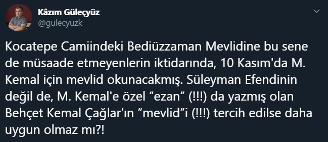 Geçen yıl Ankara Kocatepe camisinde düzenlenmek istenen Saidi Nursi mevlidinin izin verilmemesini hatırlatan Güleçyüz, "Kocatepe Camiindeki Bediüzzaman Mevlidine bu sene de müsaade etmeyenlerin iktidarında, 10 Kasım'da M. Kemal için mevlid okunacakmış. Süleyman Efendinin değil de, M. Kemal'e özel 'ezan' (!!!) da yazmış olan Behçet Kemal Çağlar'ın “mevlid”i (!!!) tercih edilse daha uygun olmaz mı?!" ifadelerini kullandı.