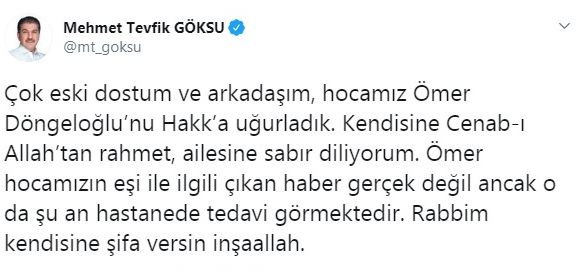 Bu konuda bir açıklama yapan Esenler Belediye Başkanı Mehmet Tevfik Göksu, koronavirüsten vefat eden İlahiyatçı Yazar Ömer Döngeloğlu'nun eşinin de hayatını kaybettiği iddialarını yalanlayarak, eşinin hastanede olduğunu bildirdi.