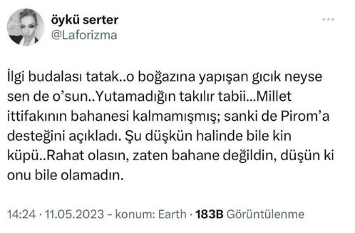 Ancak bu durumda bile bazı kesimlerin kini ve öfkesi dinmedi. Özellikle rahatsızlanması nedeniyle büyük bir endişe uyandıran Muharrem İnce, Öykü Serter'in de hedefi oldu.