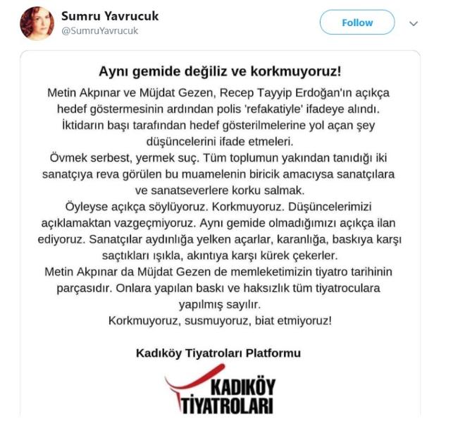 Konu ile ilgili yaptığı açıklamada ‘Övmek serbest, yermek suç’ diyen Sumru Yavrucuk, Erdoğan’a ‘Aynı gemide değiliz ve korkmuyoruz’ ifadelerini kullandı.