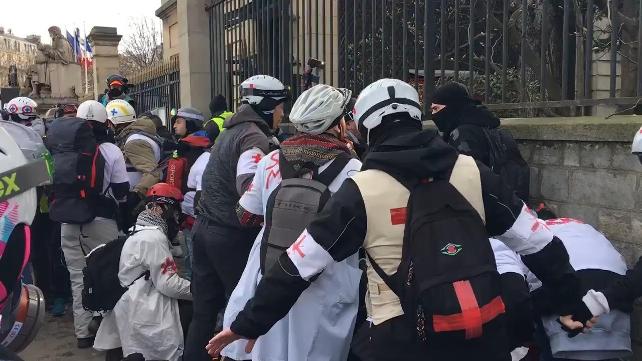 Ulusal Meclis’in önüne gelen eylemciler ‘Macron İstifa ‘ sloganları attılar. Polislerin müdahalesi sonucu bir göstericinin eli koptu, çok sayıda eylemci de yaralandı.