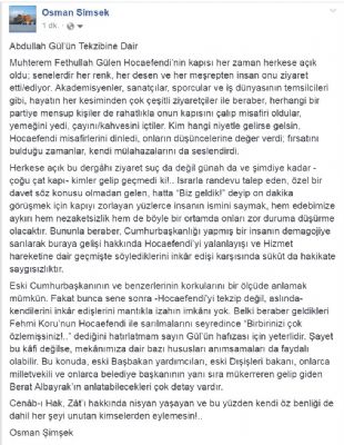 Şimşek devamında ise Abdullah Gül’ü kastederek, “Belki beraber geldikleri Fehmi Koru’nun Hocaefendi ile sarılmalarını seyredince ‘Birbirinizi çok özlemişsiniz!..’ dediğini hatırlatmam sayın Gül’ün hafızası için yeterlidir. Şayet bu kafi değilse, mekanımıza dair bazı hususları anımsamaları da faydalı olabilir” diye yazdı.