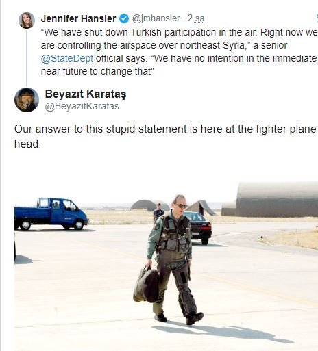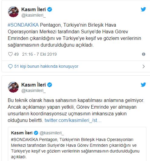 ABD ile gerilen ipler kopmak üzere...ABD Savunma Bakanlığı (Pentagon), Türkiye'nin Birleşik Hava Operasyonları Merkezi tarafından Suriye'de Hava Görev Emri'nden çıkarıldığını ve Türkiye'ye keşif ve gözlem verilerinin sağlanmasının durdurulduğunu açıkladı.