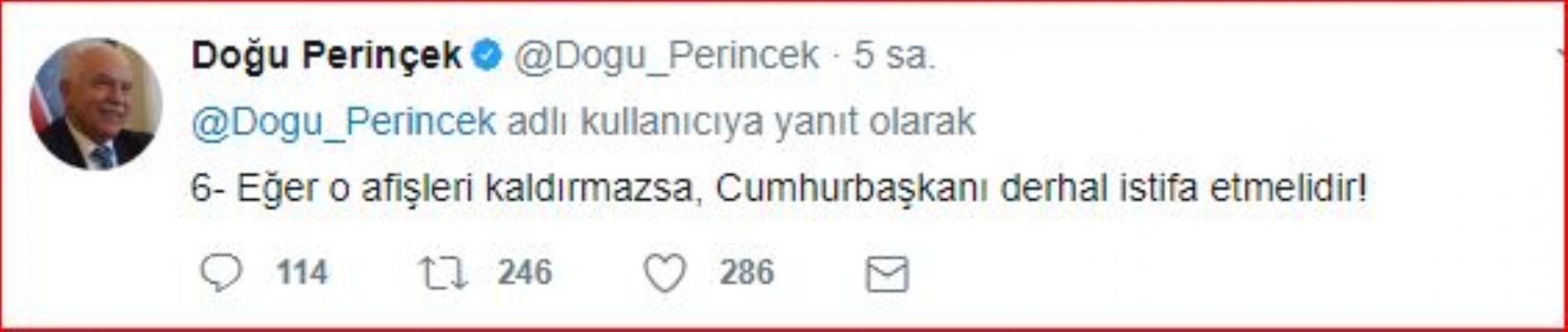 Vatan Partisi Genel Başkanı Doğu Perinçek, tartışmalı 15 Temmuz afişleri üzerinden Cumhurbaşkanı Tayyip Erdoğan’ın istifasını istedi. Perinçek, “Eğer Cumhurbaşkanı istifa etmezse, Türk Milleti onu ilk seçimde aşağı indirecektir” dedi.
