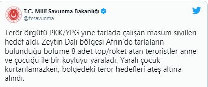 "Terör örgütü PKK/YPG, yine tarlada çalışan masum sivilleri hedef aldı. Zeytin Dalı bölgesi Afrin'de tarlaların bulunduğu bölüme 8 top mermisi ve roket atan teröristler, anne ve çocuğu ile bir köylüyü yaraladı. Yaralı çocuk kurtarılamazken, bölgedeki terör hedefleri ateş altına alındı."