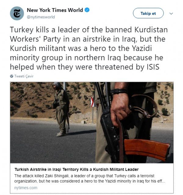 Kırmızı listede yer alan terör örgütünün lider kadrosundan İsmail Özden için, ABD'li gazete New York Times övgüler dizdi. New York Times, terör örgütlerini finanse eden ABD yönetimine paralel olarak örgüt yöneticilerini överken, terörist için 'kahramandı' ifadesini kullanması da dikkat çekti. New York Times haberde, "Türkiye, Irak'a düzenlediği hava saldırısında PKK'lı lideri öldürdü. Ancak bu Kürt militan; DEAŞ tarafından tehdit edilen Kuzey Irak'taki Yezidiler için bir kahramandı, çünkü onlara yardım etmişti" ifadelerini kullandı.
