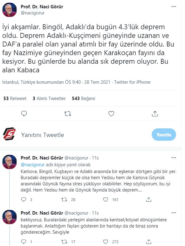 Yer bilimci ve deprem uzmanı Prof. Dr. Naci Görür Bingöl’ün Karlıova ilçesinde saat 15.27’de 4.3 büyüklüğündeki depreme ilişkin sosyal medyadan açıklamalarda bulundu.