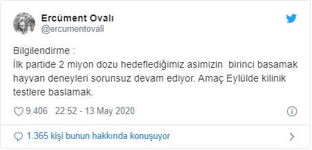 Koronavirüse karşı yürüttüğü aşı ve ilaç çalışmalarıyla gündeme gelen Prof. Dr. Ercüment Ovalı sosyal medya hesabından aşı çalışmalarının gidişatı hakkında bilgi verdi.