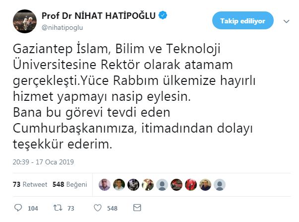 Nihat Hatipoğlu sosyal medya hesabından rektörlük görevine atanmasına ilişkin bir paylaşımda bulundu ve Cumhurbaşkanına teşekkür etti.