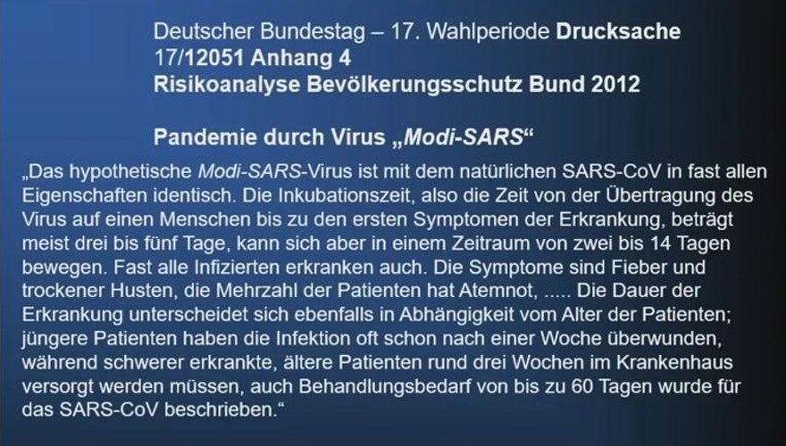 Almanya’da Robert Koch Enstitüsü Başkanlığı’nda hazırlanan “Risk Analizi ve Halkı Koruma” başlıklı raporda ‘SARS CoV’ virüsünün mutasyona uğrayıp ‘pandemi’ olacağı, tüm dünyayı etkileyeceği ve binlerce kişinin hayatını kaybetmesine neden olacağı belirtiliyor.