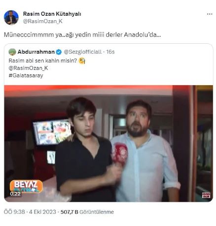 Galatasaray'ın maçı 3-2 kazanmasıyla tahminleri doğru çıkan Rasim Ozan, "Rasim abi sen kahin misin" diye soran muhabire, "Münecccimmmm ya..ağı yedin miiii derler Anadolu’da…" diye yanıt verdi.