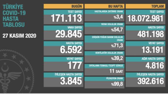 Sağlık Bakanı Fahrettin Koca'nın sosyal medya hesabından açıkladığı 27.11.2020 tarihli koronavirüs vaka tablosuna göre, son 24 saatte Türkiye genelinde 29.845 kişi daha virüse yakaladı.177 kişi ise hayatını kaybetti