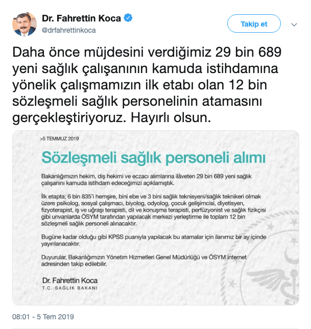 Koca'nın Twitter'dan paylaştığı bilgilere göre bakanlığa 12 bin personel alınacak.