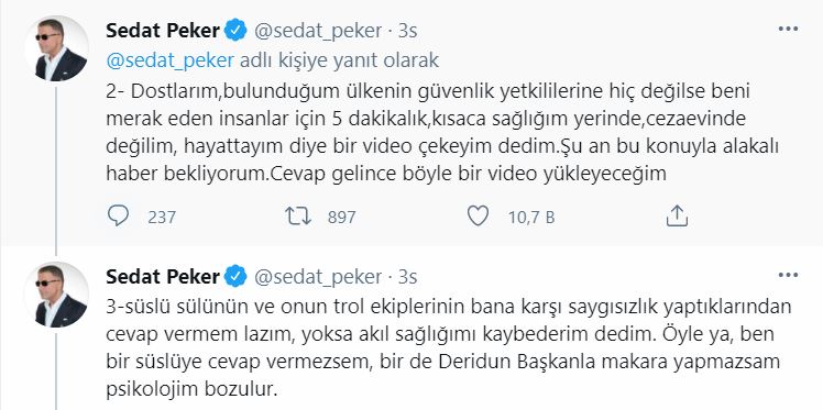 Peker paylaştığı twitter mesajında, en üst düzeyde suikaste uğrayacağı yönünde bilgiler olduğunu yazdı.