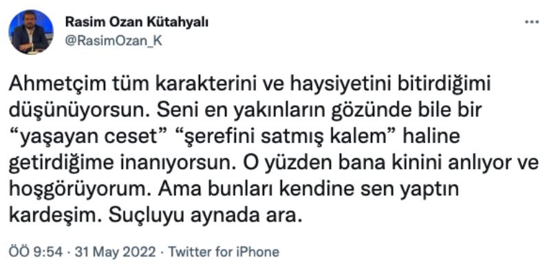 Köşe yazısına Twitter hesabından cevap veren ve “Ahmetçim tüm karakterini ve haysiyetini bitirdiğimi düşünüyorsun. Seni en yakınların gözünde bile bir ‘yaşayan ceset’, ‘şerefini satmış kalem’ haline getirdiğime inanıyorsun. O yüzden bana kinini anlıyor ve hoşgörüyorum” diyen Rasim Ozan Kütahyalı, devamında “Ama bunları kendine sen yaptın kardeşim. Suçluyu aynada ara” ifadelerini kullandı.