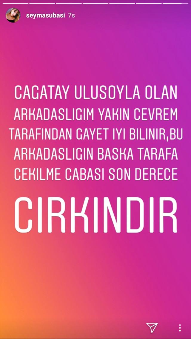Şeyma Subaşı, Instagram hesabından bir açıklama yaparak iddialara son noktayı koydu. Çağatay Ulusoy'la uzun zamandır arkadaş olduklarını ve bu durumun yakın çevresi tarafından bilindiğini belirten Şeyma Subaşı açıklamasında, 'Çağatay Ulusoy'la olan arkadaşlığım yakın çevrem tarafından gayet iyi bilinir. Bu arkadaşlığın başka tarafa çekilme çabası son derece çirkindir' ifadelerini kullandı.