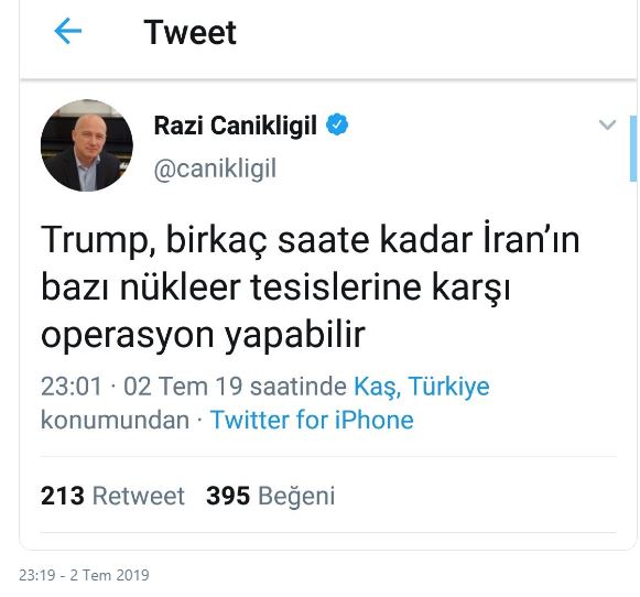 Hürriyet gazetesi New York temsilcisi Razi Canikligil ABD’nin bu gece İran'ı vuracağını iddia etti.