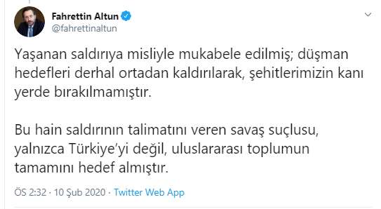 Uluslararası hukuktan kaynaklanan haklarımız çerçevesinde İdlib’de şiddeti ve insani krizi sonlandırmak amacıyla görev yapan kahraman askerlerimize yönelik hain saldırıda şehit olan evlatlarımıza Allah’tan rahmet; yaralılarımıza acil şifalar diliyorum.