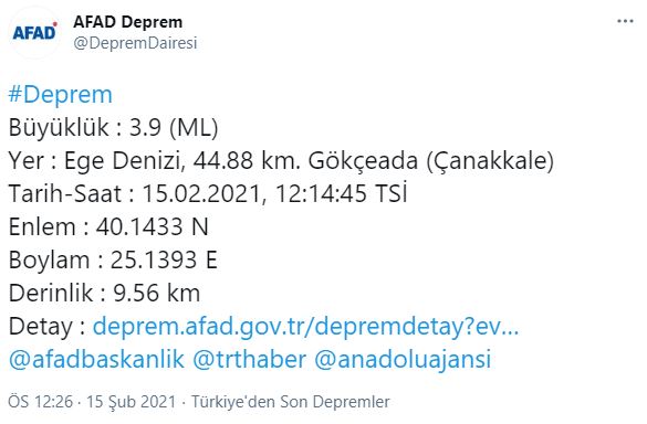 AFAD Çanakkale Gökçeada açıklarında saat 12.14'de 3.9 büyüklüğünde deprem meydana geldi.